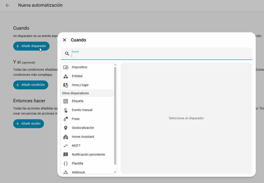Vamos a ver cómo funciona la nueva forma de añadir activadores, condiciones y acciones. Esto aplica tanto a automatizaciones como scripts. Por ejemplo, crea una automatización y prueba añadir un nuevo disparador. Esto abrirá una ventana nueva donde puedes ver los cambios que incorpora esta Home Assistant 2025.11.