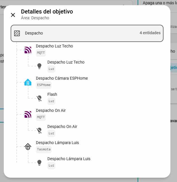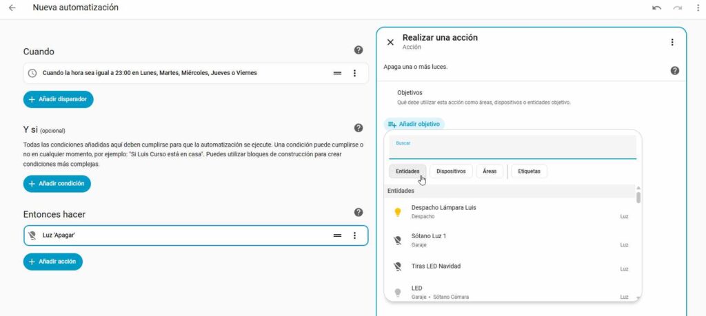 Por ejemplo, lo puedes aplicar sobre una planta o un área como despacho. Una vez seleccionado, puedes ver qué entidades se apagarán haciendo clic en entidades. Pero también puedes hacerlo por etiquetas. Puedes crear una etiqueta que se llame Apagar Luces y asignarla a todos los dispositivos sobre los que quieres actuar en un determinado momento.