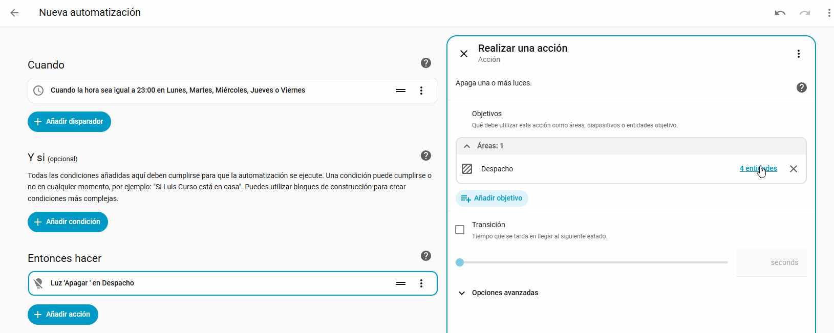 A partir de ese momento cada vez que se lance la automatización apagará también esa luz sin tener que haber modificado la automatización. Esa es la potencia de este tipo de acciones y gracias al nuevo selector, ahora podemos ver con más claridad sobre qué entidades se va a actuar.