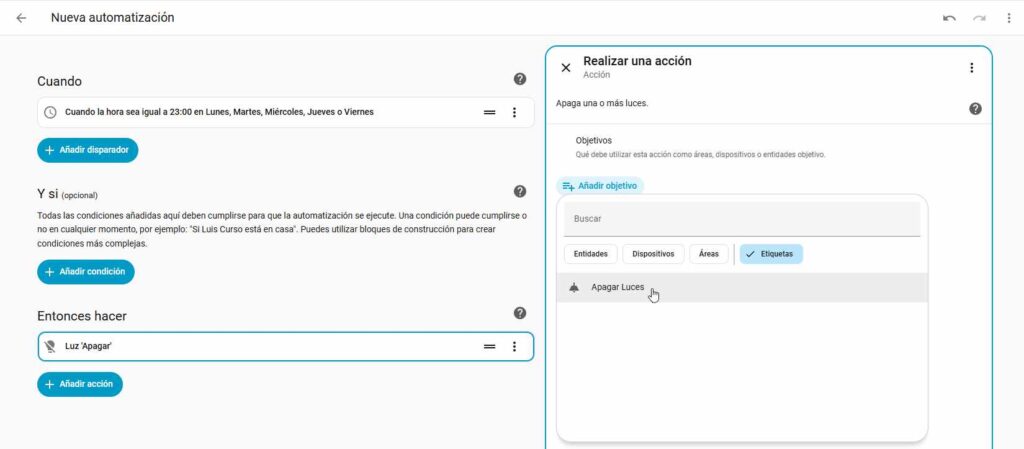 Lo realmente potente de este tipo de acciones es que si mañana añades una luz en el balcón y quieres que también se apague a las once de la noche, bastaría con integrarlo en Home Assistant y asignar la etiqueta de Apagar Luces.