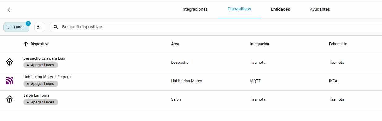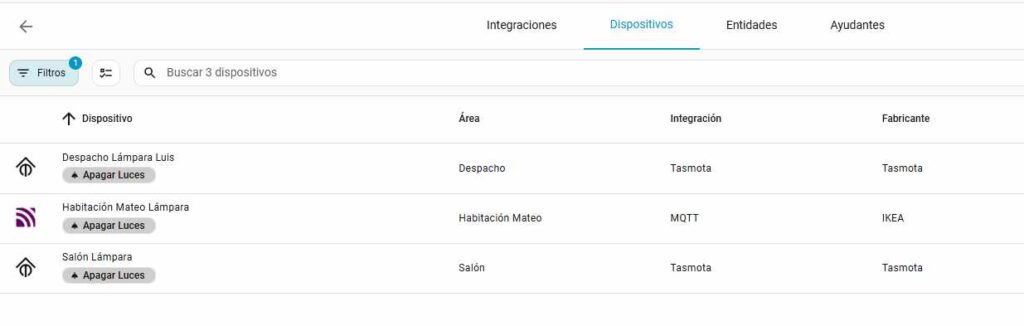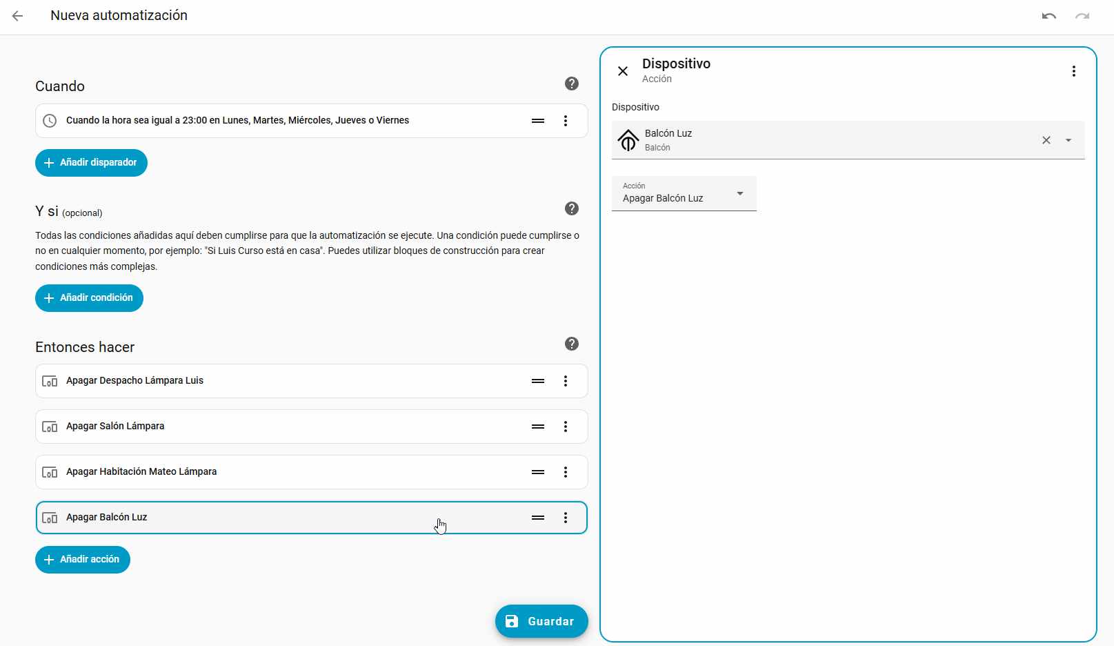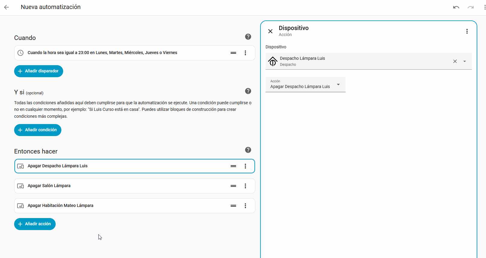 La lámpara que hay en el despacho, la lámpara que hay en el salón y la lámpara que hay en la habitación de Mateo. Y así con el resto de luces de tu casa hasta añadir todas las que quieres que se apaguen.