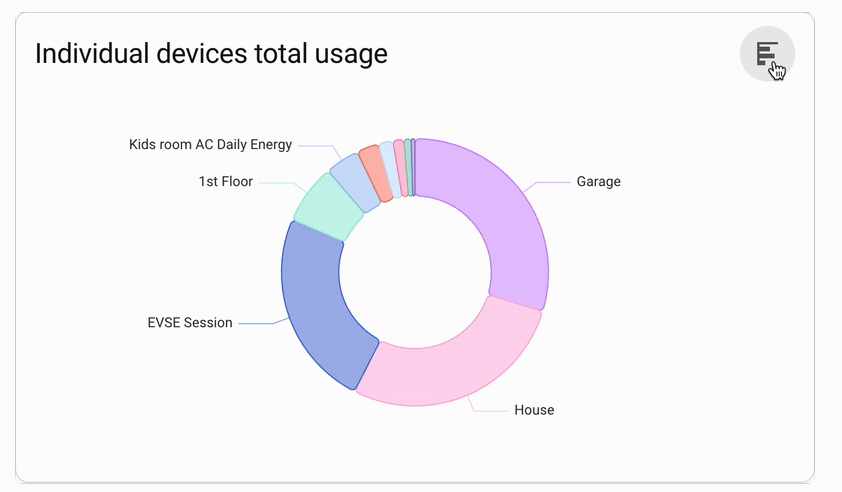 El gráfico de energía de los dispositivos ahora tiene un nuevo diseño, gráfico circular. Puedes alternar entre gráfico de barras tradicional y el nuevo gráfico circular haciendo clic en el icono de la esquina superior derecha.