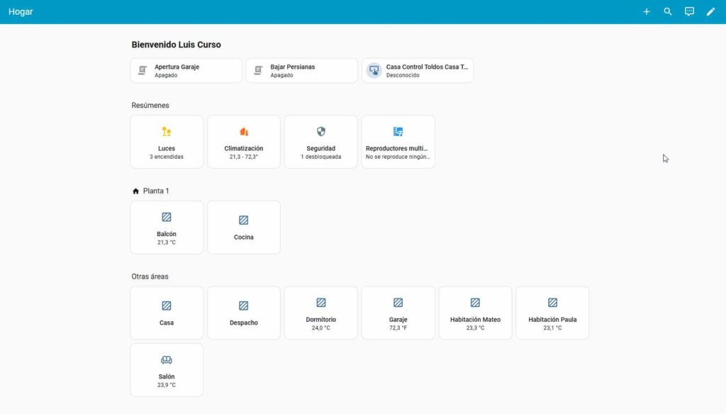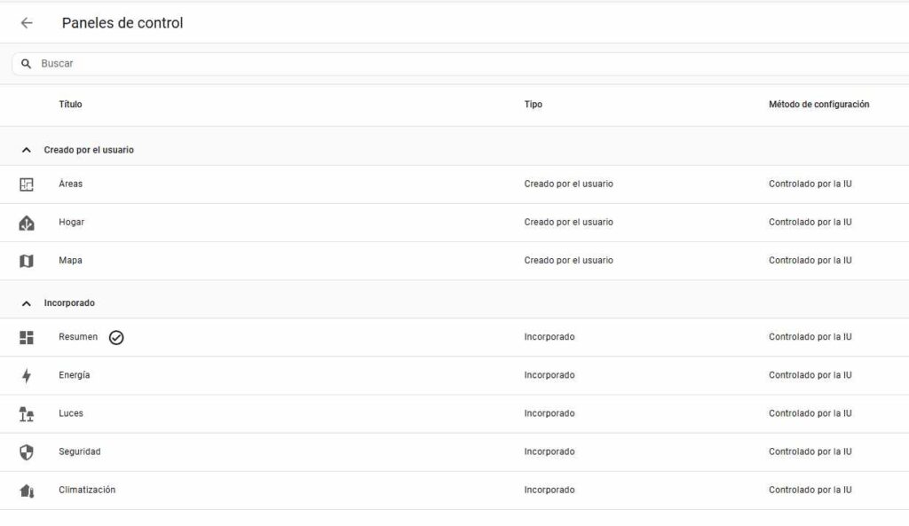 Se han creado vistas de luces, clima y seguridad de forma automática y a las que podemos acceder a través de los enlaces en la vista de inicio. Puedes ver estos paneles en Configuración>Paneles de control.