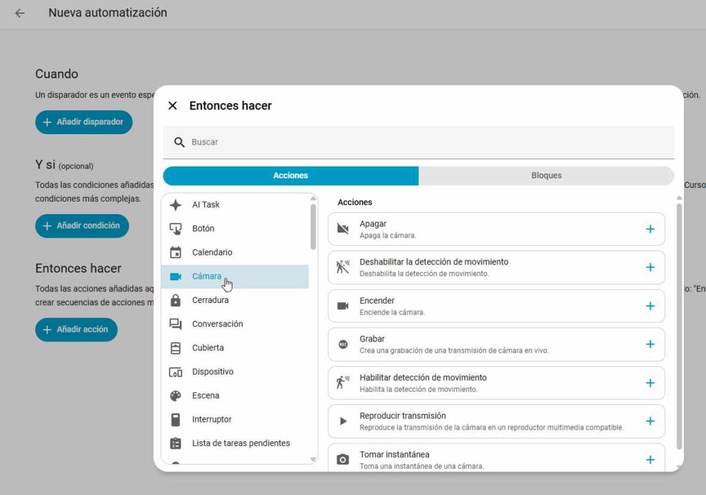 Por último, tenemos las acciones que es donde quizás más vamos a notar este cambio ya que hay muchas acciones que podemos ejecutar en las automatizaciones y scripts. Al añadir una nueva acción se abre un cuadro de diálogo igual que en los disparadores y condiciones.