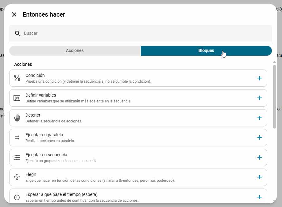 Aparte, como es habitual en las acciones, tenemos una pestaña donde podemos encontrar los bloques para añadir condicionales, repeticiones o ciertas acciones sobre la automatización. No cabe duda que esta novedad de la versión Home Assistant 2025.11 será un punto de inflexión a la hora de crear nuestras automatizaciones y scripts.