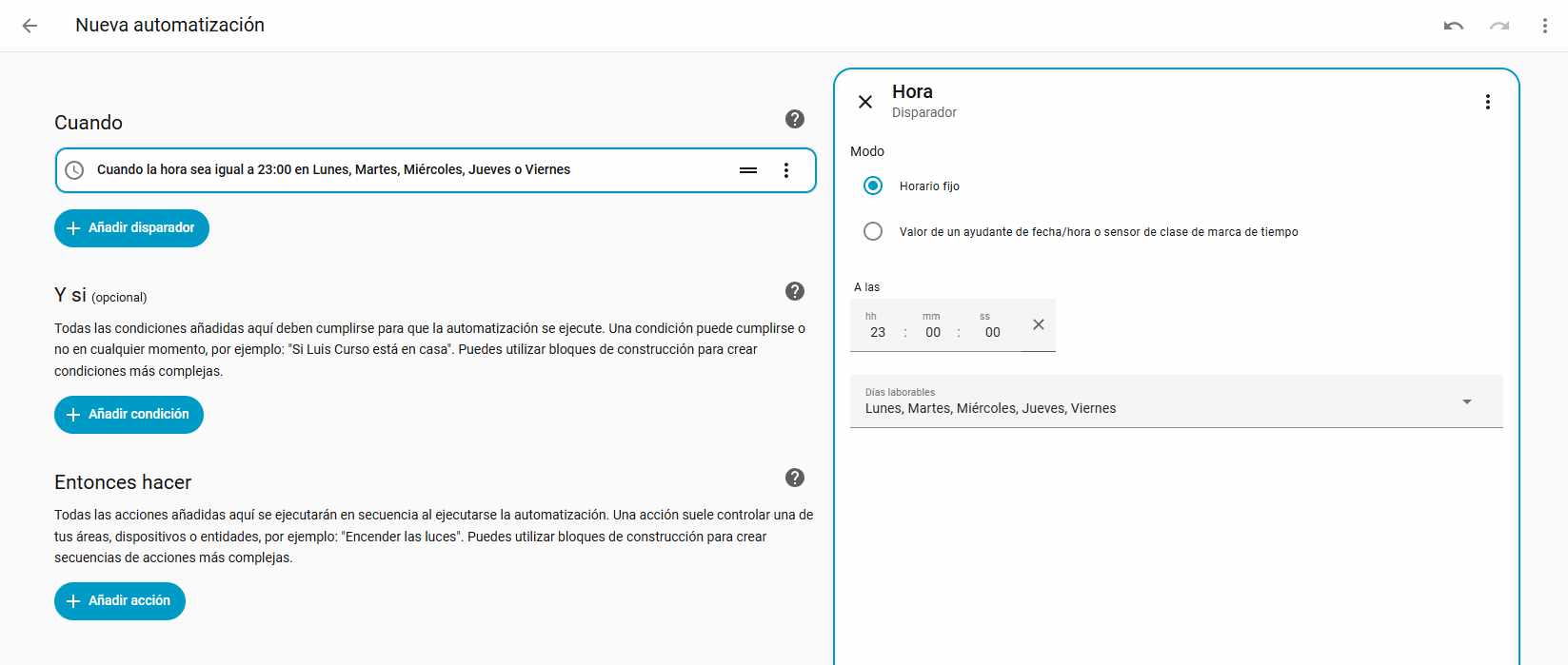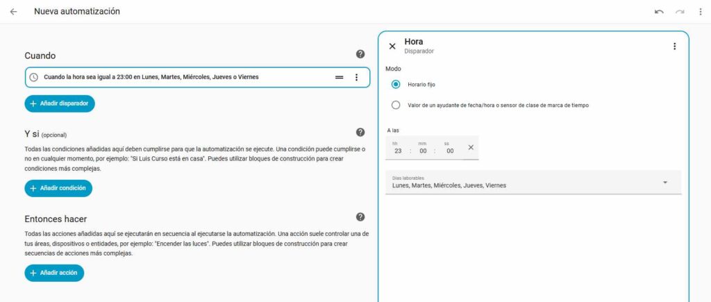 Esto se podría hacer de una forma relativamente sencilla si creas una automatización donde el disparador sea del tipo hora para que lance la automatización a las once de la noche de lunes a viernes. Luego, en acciones, vas añadiendo todas las luces de tu casa.