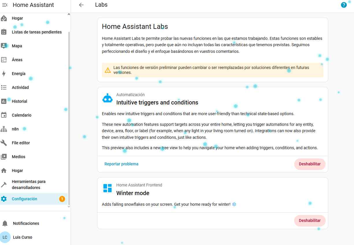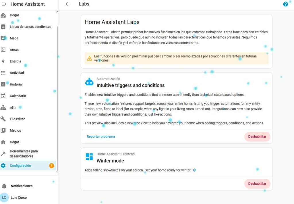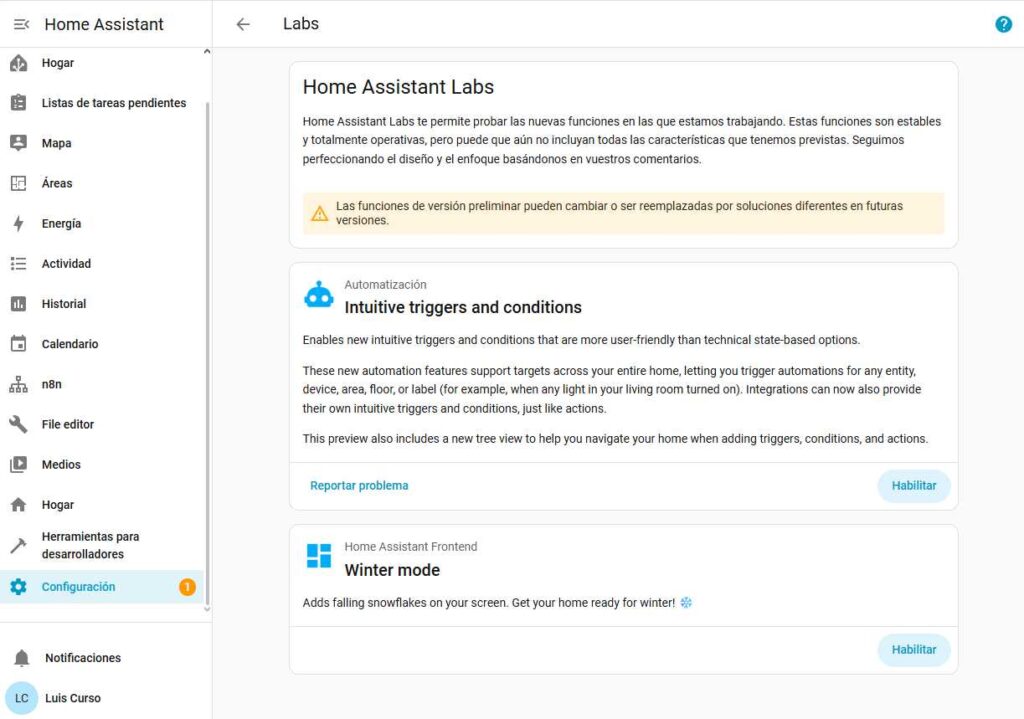Con la versión 2025.12, esto cambia radicalmente. Se ha introducido una sección dedicada dentro de los ajustes del sistema llamada «Labs». Esta área funciona como un taller de pruebas accesible, donde cualquier usuario puede habilitar funciones experimentales con un solo clic.