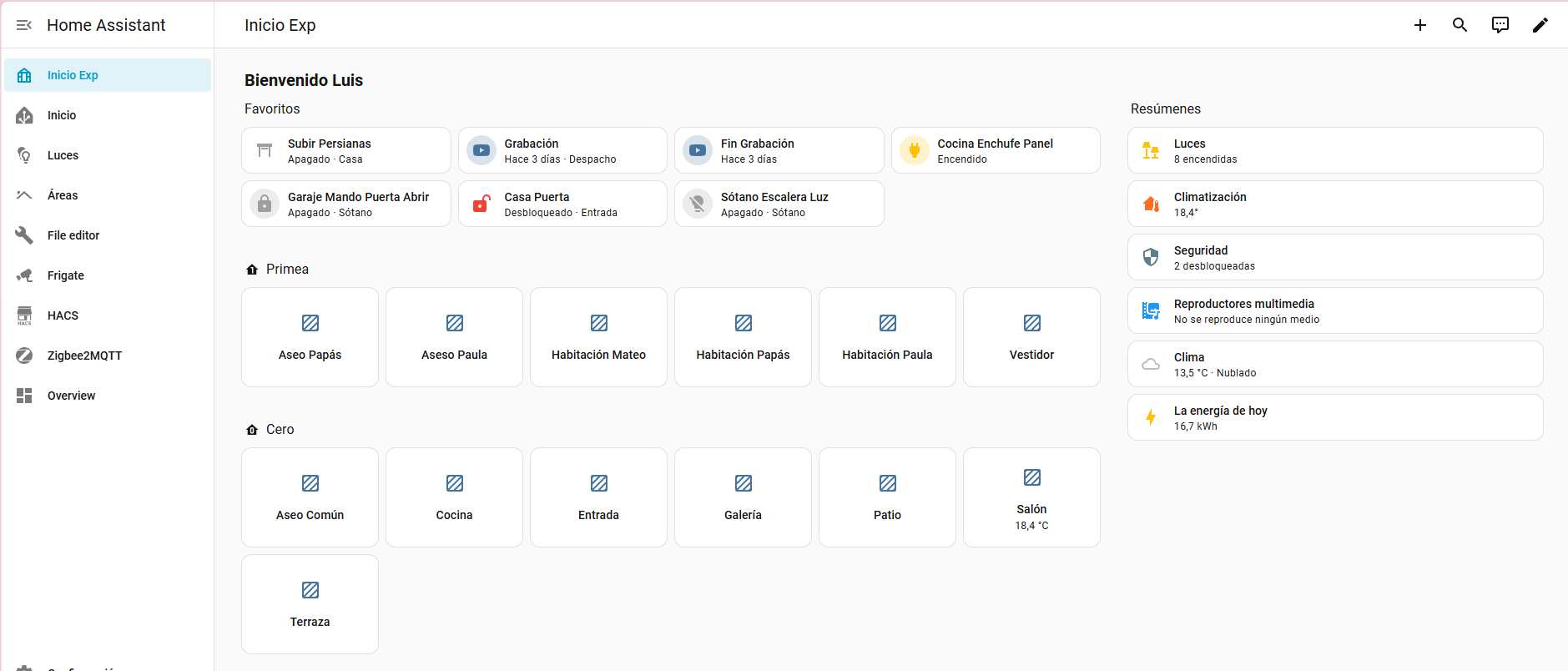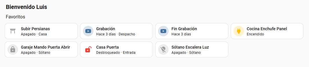 Fíjate en la estructura, porque tiene todo el sentido del mundo: Arriba del todo, tu mensaje de bienvenida y, justo debajo, tus Favoritos. Esas cosas que usas cien veces al día: apagar todas las luces, abrir el garaje o subir las persianas. A tiro de un clic. Puedes personalizarlo si pulsas en el lápiz donde puedes seleccionar entidades y scripts.