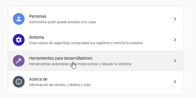 1. El Misterio de las Herramientas para Desarrolladores ¡Que no cunda el pánico! No han desaparecido. Sé que más de uno va a entrar, no va a ver el martillo en el menú lateral y le va a dar un parraque. Tranquilos. Las han movido dentro del menú de Configuración. Tiene sentido, pero ya nos conocemos y luego me venís llorando con que se os ha roto el Home Assistant. Avisados quedáis.