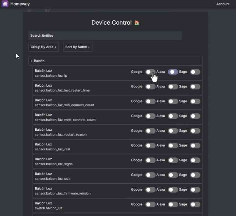- Anteriormente, Homeway requería filtrado manual de entidades para su exposición a Alexa/Google. Esto implica que el usuario debe decidir qué dispositivos o entidades se pueden controlar o consultar por voz.