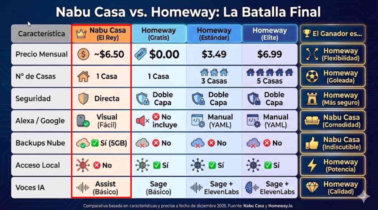 Notas finales: Este artículo está construido a partir del resumen de un vídeo de YouTube que compara Home Assistant Cloud y Homeway, enfocándose en su funcionamiento, seguridad, exposición de entidades, acceso local, desarrollo futuro y precios. Si detectas cambios en las plataformas o nuevas funcionalidades, no dudes en compartir tus experiencias para enriquecernos como comunidad hispana de domótica.