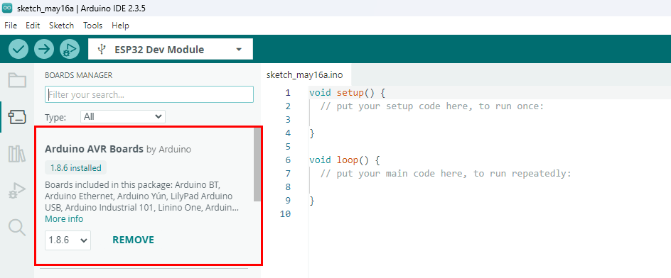 La programación la vamos a hacer igual que hemos hecho con el nodo del buzón, a través del IDE de Arduino. En este caso hay que instalar la compatibilidad con las placas ESP32 a través del gestor de placas. Una vez instalada selecciona la placa genérica ESP32 Dev Module. Conecta la placa TTGO LoRa32 al ordenador y selecciona el puerto.