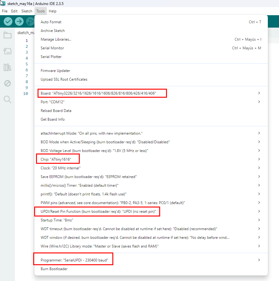 En la configuración del microcontrolador asegúrate que tienes seleccionado el chip Attiny1616, UPDI no reset pin y el programador Serial UPDI 230400 baud. Por último selecciona el puerto en el que está conectado el programador UNIPRog.