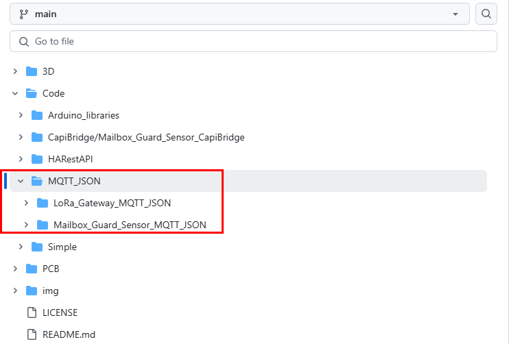 El código que vamos a utilizar es el que está dentro de MQTT JSON. Verás dos directorios. Abre el que corresponde con el MailboxGuard. Dentro verás un archivo .ino. Copia el código, llévatelo al IDE de Arduino y guárdalo en tu disco duro.