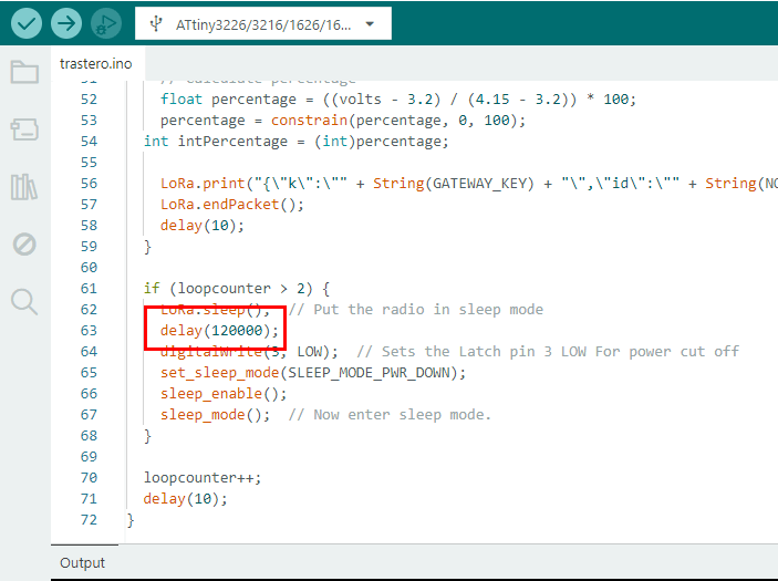 Esto se puede evitar añadiendo un delay en el código justo después de echar a dormir el módulo LoRa. Lo que hace el delay es parar la ejecución del código durante un tiempo configurable pero ¿Durante cuánto tiempo? El tiempo necesario para que se ajuste al duty cicle.