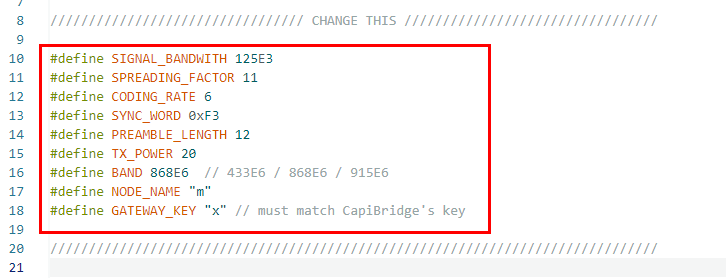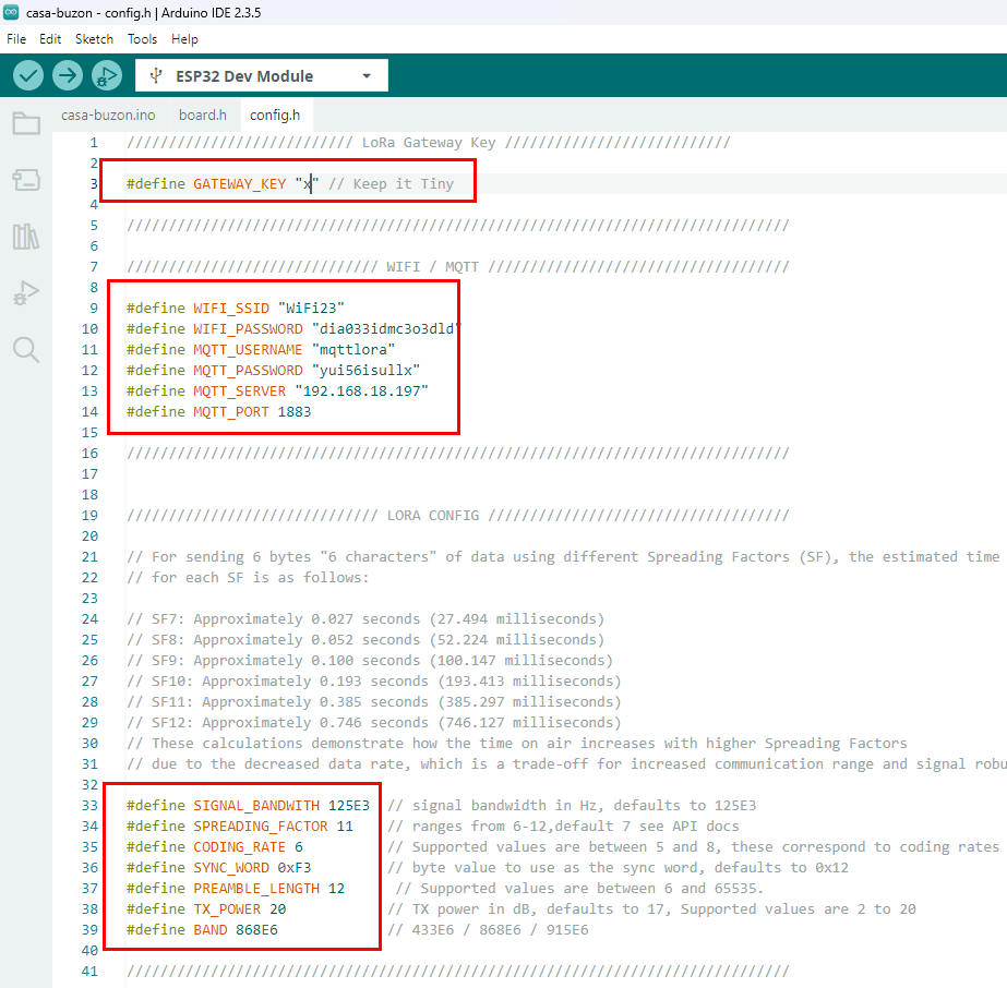Respecto a la configuración de LoRa no improvises ya que tienes que poner la misma configuración que utilizas en el nodo que va en el buzón. El mismo ancho de banda, spreding factor, coding rate y preámbulo.