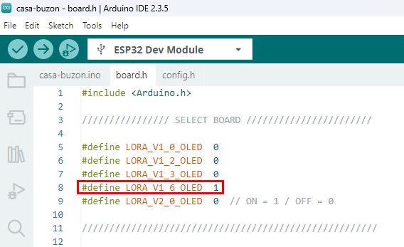 El código principal, lo copiamos en el IDE de Arduino y lo guardamos. Y luego tenemos 2 códigos más. Uno para configurar la placa, board.h y otro, config.h, para configurar la conexión a la red WiFi, al servidor MQTT de Home Assistant y la configuración de LoRa.